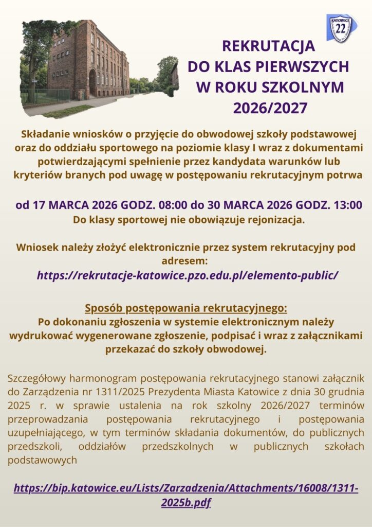 Najważniejsze informacje dla rodziców dzieci, które w roku szkolnym 2026/2027 rozpoczynają naukę w klasie pierwszej