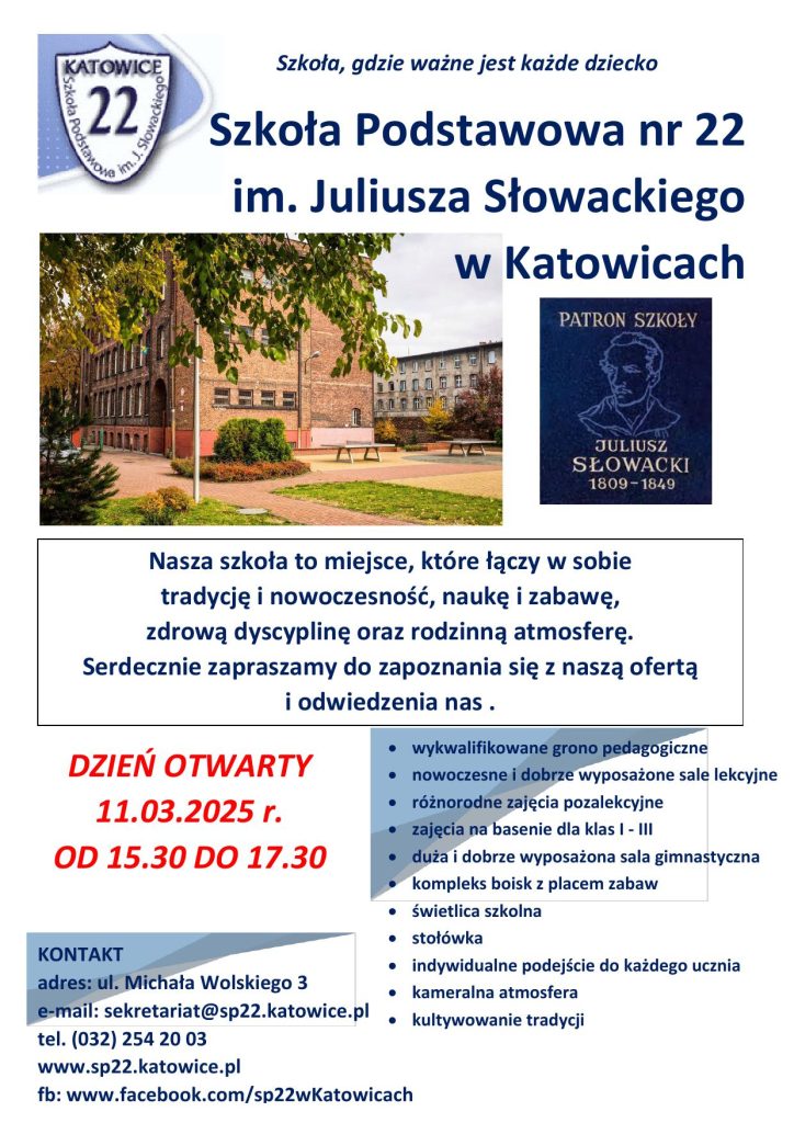 Zgodnie z zarządzeniem Prezydenta Miasta Katowice z 04.12.2024 roku, Dyrektor Szkoły Podstawowej nr 22 im. Juliusza Słowackiego w Katowicach informuje, że rekrutacja do klasy pierwszej rozpoczyna się 10 marca 2025 roku o godzinie 8.00 i potrwa do 19 marca 2025 roku do godziny 13.00. Nabór będzie się odbywał przy wsparciu systemu elektronicznego pod linkiem.