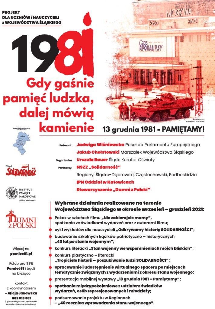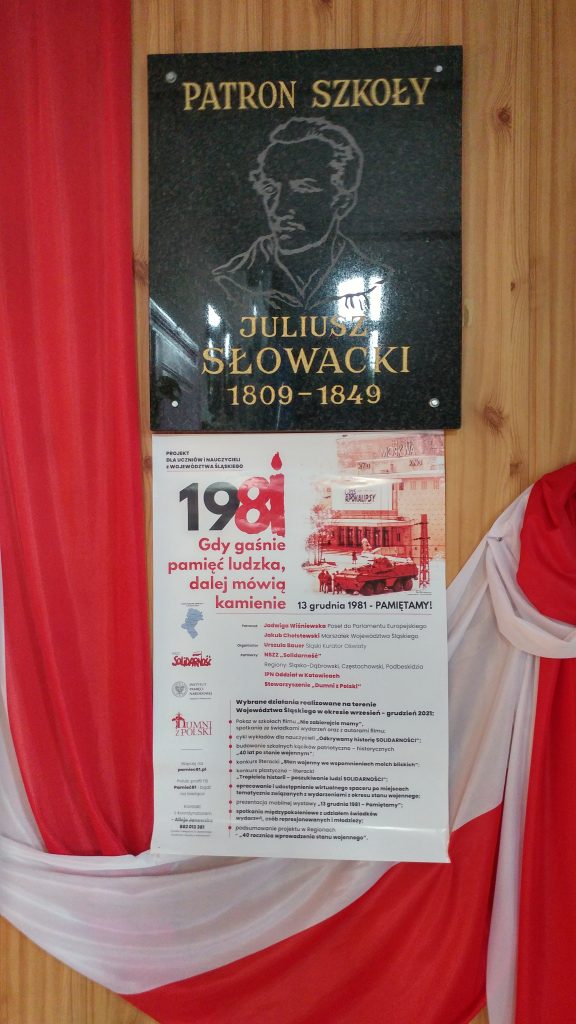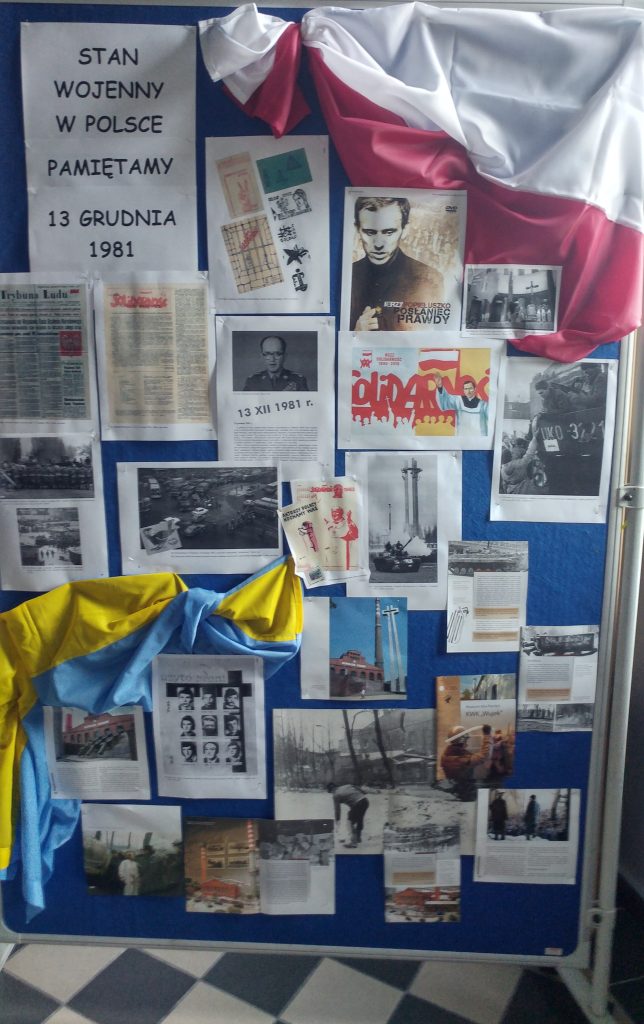 W związku ze zbliżającą się 40. rocznicą wprowadzenia stanu wojennego w Polsce nasza szkoła bierze udział w projekcie „GDY GAŚNIE PAMIĘĆ LUDZKA, DALEJ MÓWIĄ KAMIENIE – 13 GRUDNIA 1981 – PAMIĘTAMY!”. Projekt ma na celu przygotowanie uczniów do przeżywania grudniowego wydarzenia.