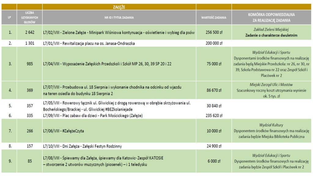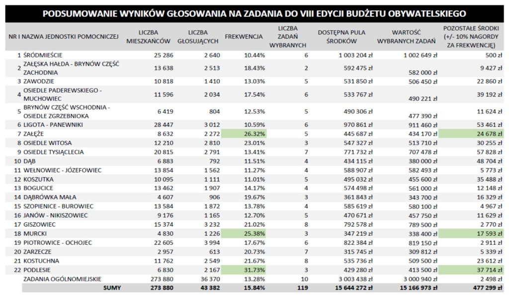 Składamy serdeczne podziękowania wszystkim, którzy przyczynili się do wygranej projektu „L7/04/VIII – Wyposażenie Załęskich Przedszkoli i Szkół MP 26, 30, 39 SP 20 i 22”. W sumie otrzymał on 985 głosów! Dodatkowo, dzięki wysokiej frekwencji podczas głosowania (26,32%), nasza dzielnica uplasowała się na zaszczytnym drugim miejscu wśród najaktywniejszych katowickich dzielnic! Dzięki temu zgodnie z decyzją prezydenta, w przyszłym roku na Załęże trafią dodatkowe, bonusowe środki – aż 13 tys. zł!