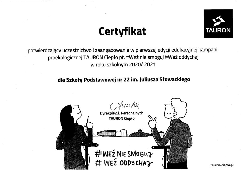 Miło nam poinformować, że nasza szkołą otrzymała certyfikat potwierdzający udział w pierwszej edycji edukacyjnej kampanii TAURON Ciepło „#Weź nie smoguj #Weź oddychaj”.
