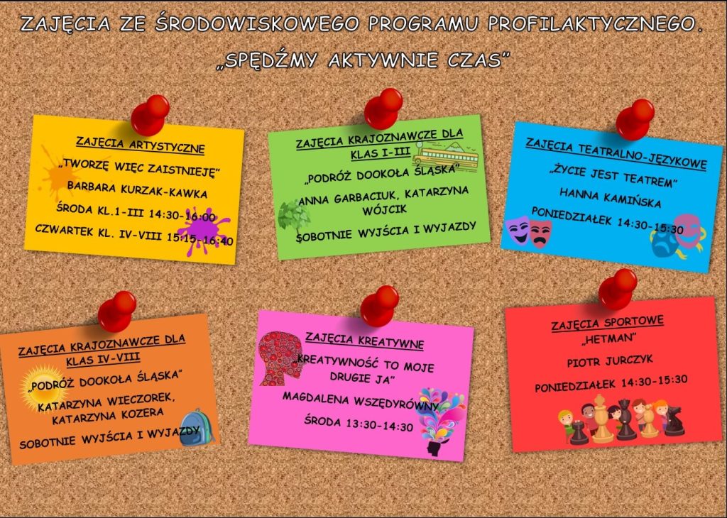 - Zajęcia artystyczne „Malarz naszych czasów” mające na celu rozwijanie umiejętności twórczego myślenia i przenoszenie go w realne przedsięwzięcia. Dzięki nim uczeń zrozumie rolę sztuki w życiu człowieka oraz jej możliwości w zdobywaniu doświadczenia życiowego, które pozwoli mu tworzyć dzieła ważne dla społeczności szkolnej.