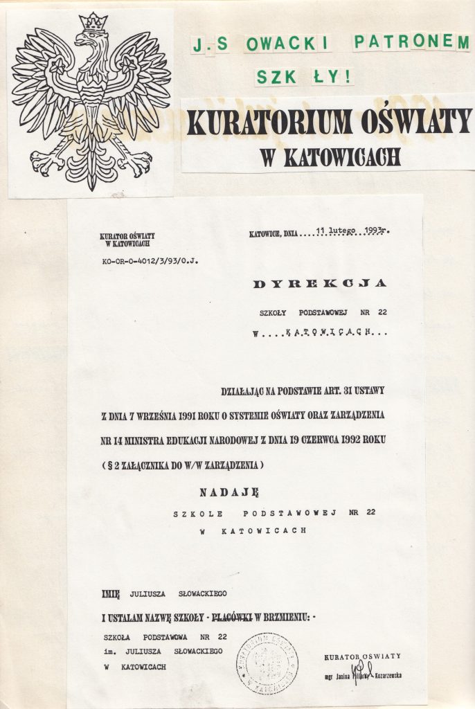 W roku 1990 rozpoczęto starania o przywrócenie dawnego imienia szkoły. 31 sierpnia 1990 r. Kuratorium Oświaty w Katowicach anulowało, na prośbę szkoły, nadane jej w 1962 r. imię Anastazego Kowalczyka. Pierwszego września 1992 roku szkoła została przejęta przez miasto Katowice i stała się szkołą miejską. Wkrótce później rada pedagogiczna wystąpiła o przywrócenie szkole imienia Juliusza Słowackiego. Akt ten dokonał się w 1993 roku uchwałą Rady Miejskiej z dnia 27 września 1993 r. Trzeciego grudnia tego samego roku zatwierdzono pierwszy statut w historii szkoły.