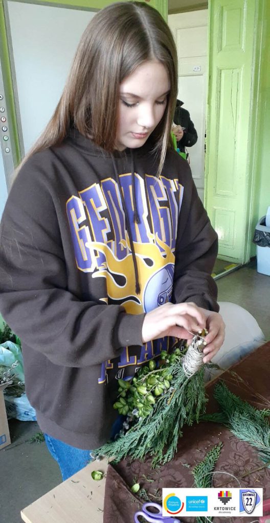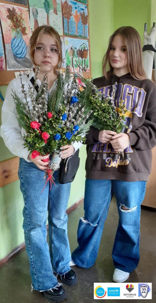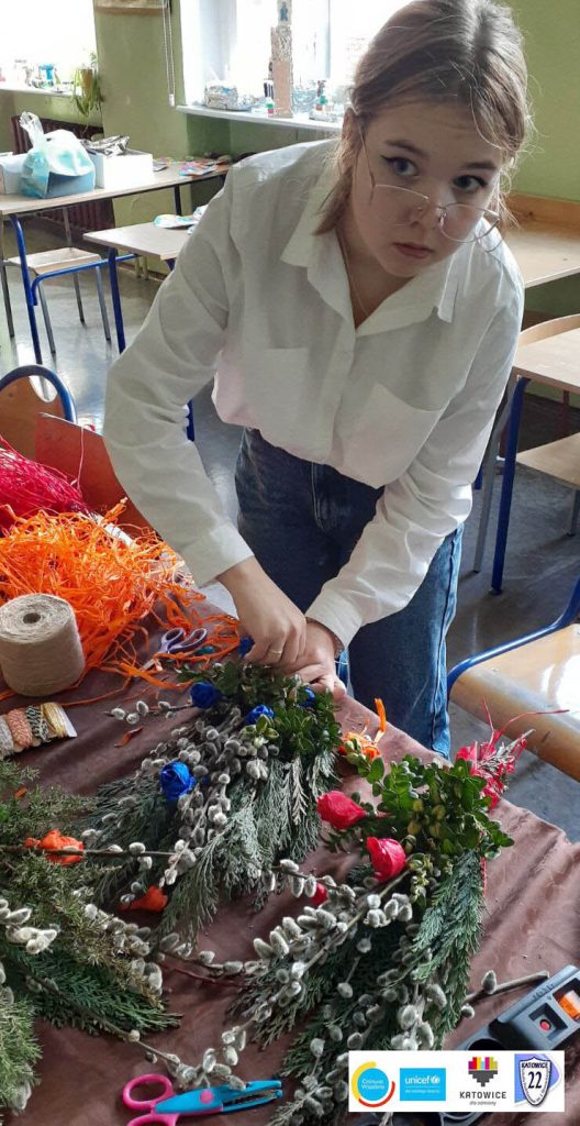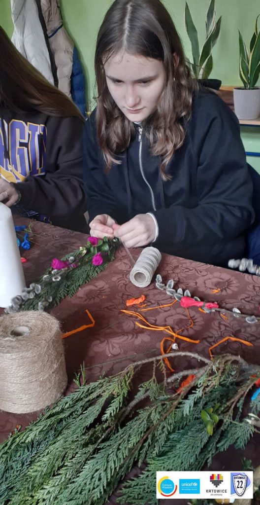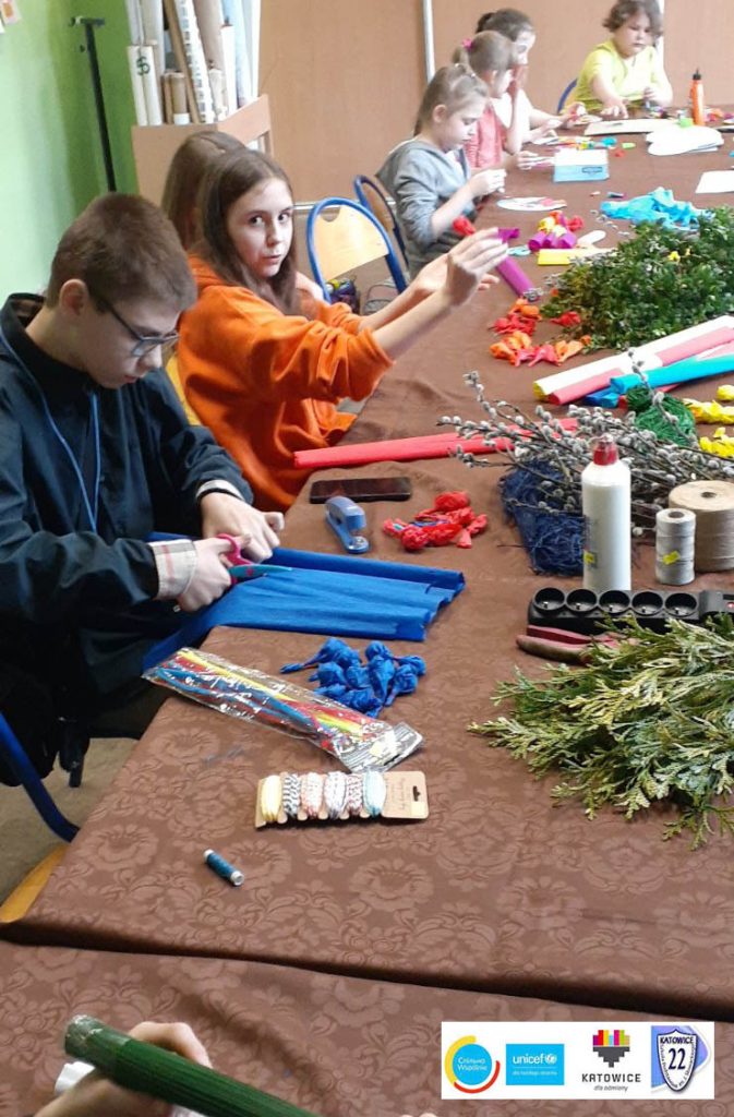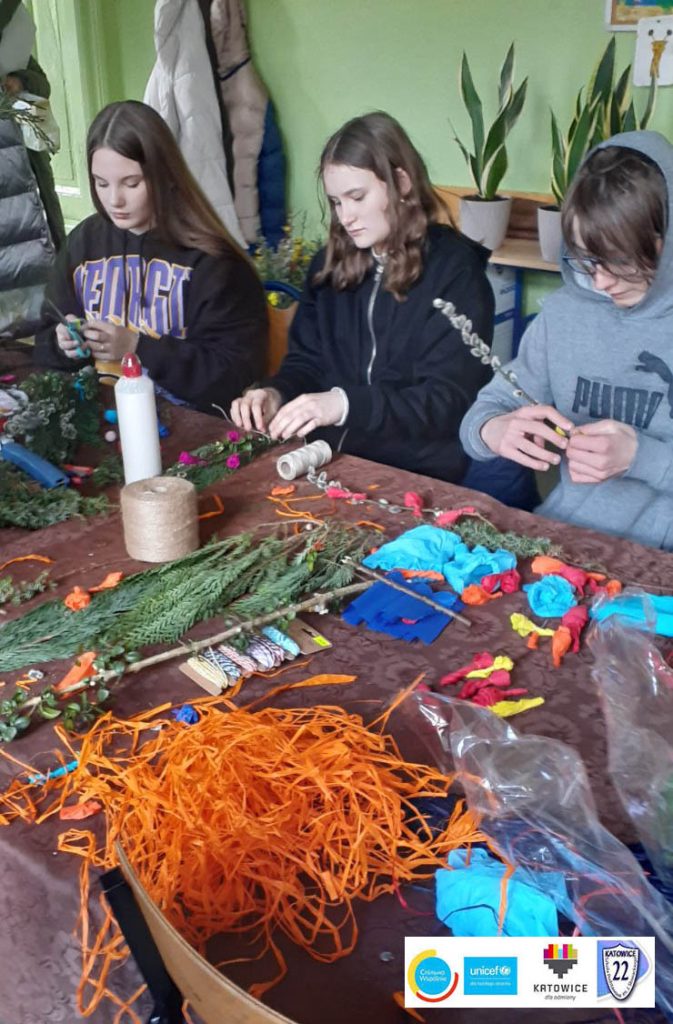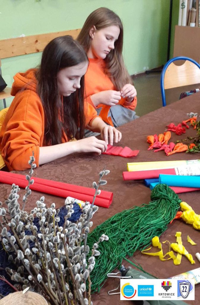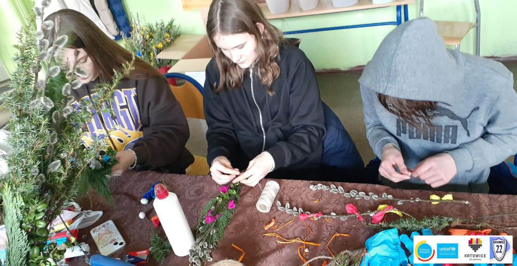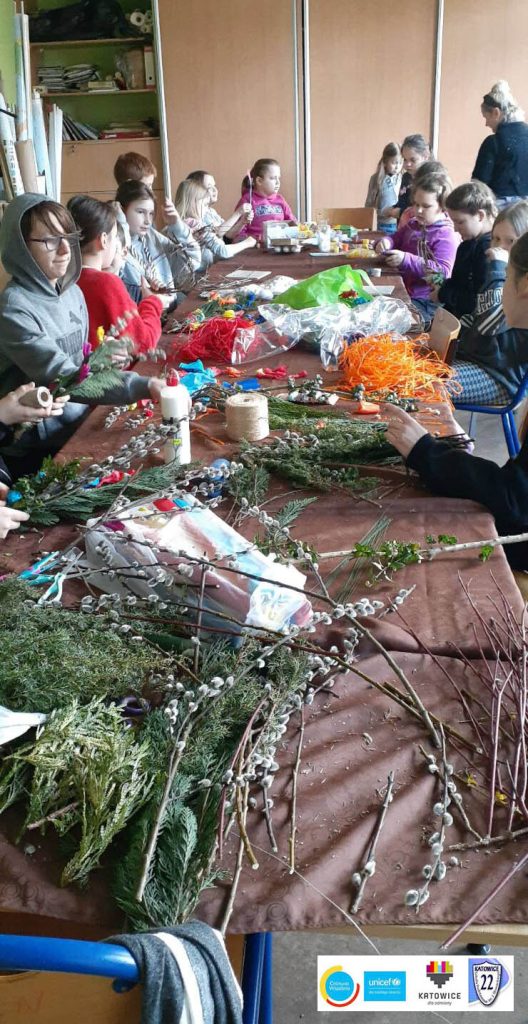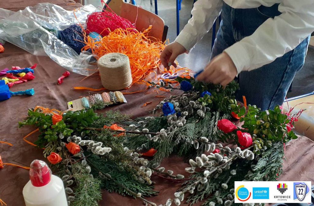 Ukraińskie i polskie dzieci wspólnie stworzyły palmy na Święta Wielkanocne. W ten sposób ukraińskie dzieci mogły poznać polskie tradycje wielkanocne.